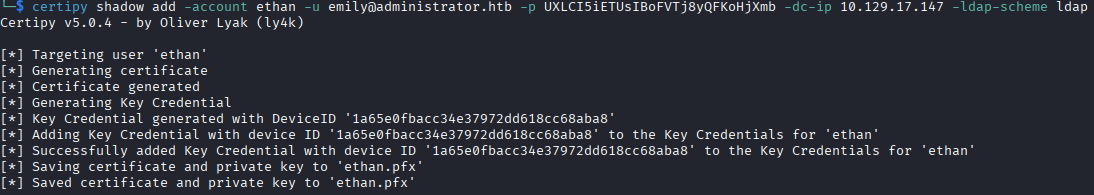 To compromise the ethan account, we can either attempt a kerberoast or a shadow credential attack. The passwords for these users have been massive strings of random letters and numbers, so I'm thinking shadow credential will be much easier.