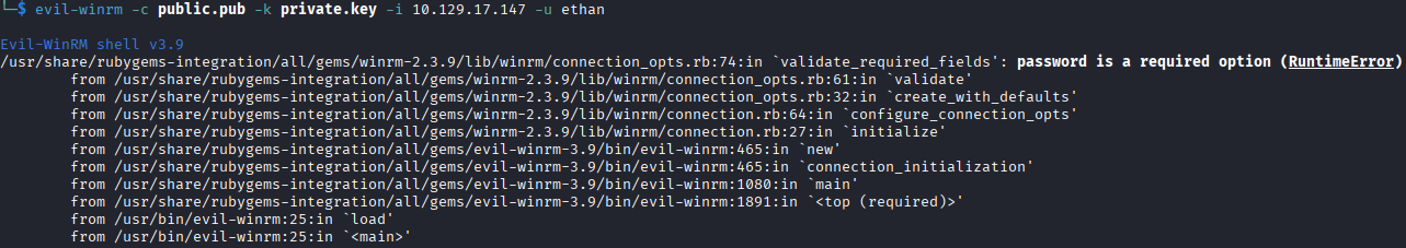 I also attempted breaking the pfx into public and private key to authenticate using evil-winrm, but that is also not allowed as it specifies that it requires a password.