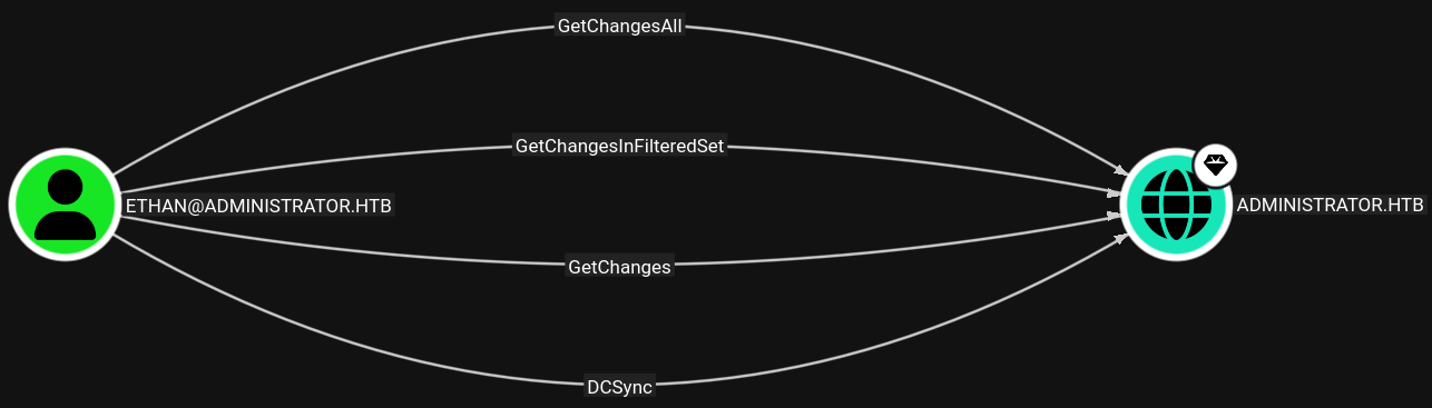 Having the ethan account's password, we can proceed with privilege escalation. Referring back to Bloodhound, I see that the ethan account has several outbound object controls over the DC, including DCSync, I review the DCSync hacktricks.wiki entry, which states that with the appropriate privileges, the ethan account can initiate the DCSync, having our attacker machine pose as a DC asking the administrator.heb DC to replicate information.