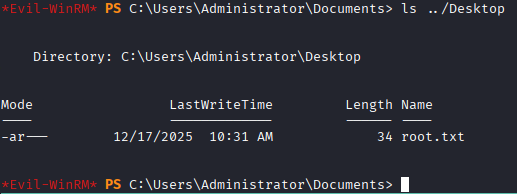 We can use the NT hash for the administrator account to login and grab the flag. Note the command for evil-winrm here is: