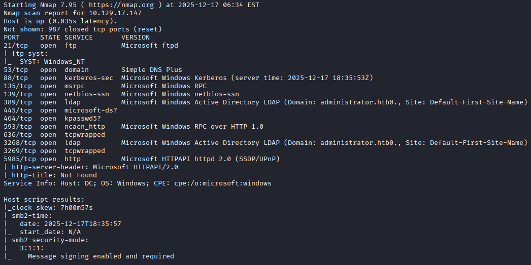 I start with scanning the ports with nmap to begin enumerating the box. The nmap scan shows a Windows box with multiple ports listening, as well as leaking the domain administrator.htb. Noting here that we also see FTP is listening as well, although for some reason I completely miss this when reviewing the list several times.