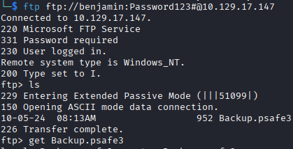 Knowing that FTP is listening, I try logging in michael to test if the Share Moderators group is the one that allows access, and it turns out it is. Only benjamin is allowed to access the FTP, which has a Backup.psafe3 file.