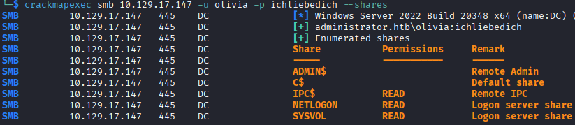 I enumerate SMB shares using crackmapexec, which our unprivileged user only has read access to IPC$, NETLOGON, and SYSVOL. I check the scripts folder in SYSVOL, which is empty, then leave the rest alone for now.