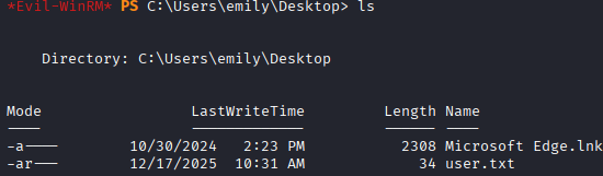 I quickly evil-winrm to the computer as emily and grab the user.txt flag.