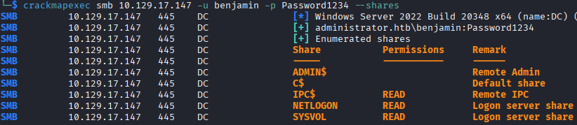 I check the SMB shares as benjamin, thinking that account will have different permissions, which it doesn't. The account has the same permissions as the others with regards to SMB, but benjamin does not have the group that allows remote access and instead has the Share Moderators group.