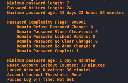 I use netexec again to get the password policy, which shows no threshold for lockouts.