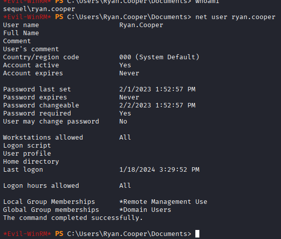 I login to the box using evil-winrm as the sql_svc user and begin looking for misconfigurations or credentials. From a meta perspective, I know I need to move laterally to ryan.cooper, but in a real world engagement I may not know that so I'm going to keep enumerating normally. I check dsacls.exe for weak permissions and don't find any.