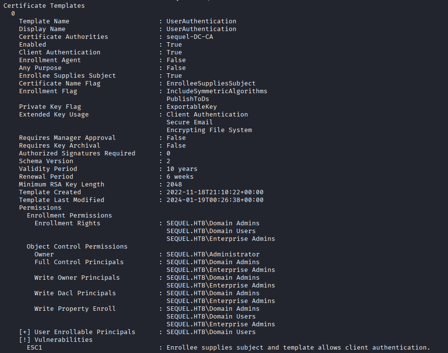 The privilege escalation is simple with this template, we use certipy to enroll in the certificate and supply administrator@sequel.htb as the Subject Alternative Name (SAN). After the request, I get a PFX certificate back and use certipy auth to get the NTLM hash for the Administrator user.