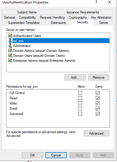I see in the “Security” tab for the template that we abused, UserAuthentication, that sql_svc is specifically denied from doing anything with this template, including viewing it. Again, that feels a little game-y, as I don't know why you would do that specifically for the account and not use some kind of group to do that, but I don't have a lot of experience administering an Active Directory environment so maybe specifically denying users from something is normal.