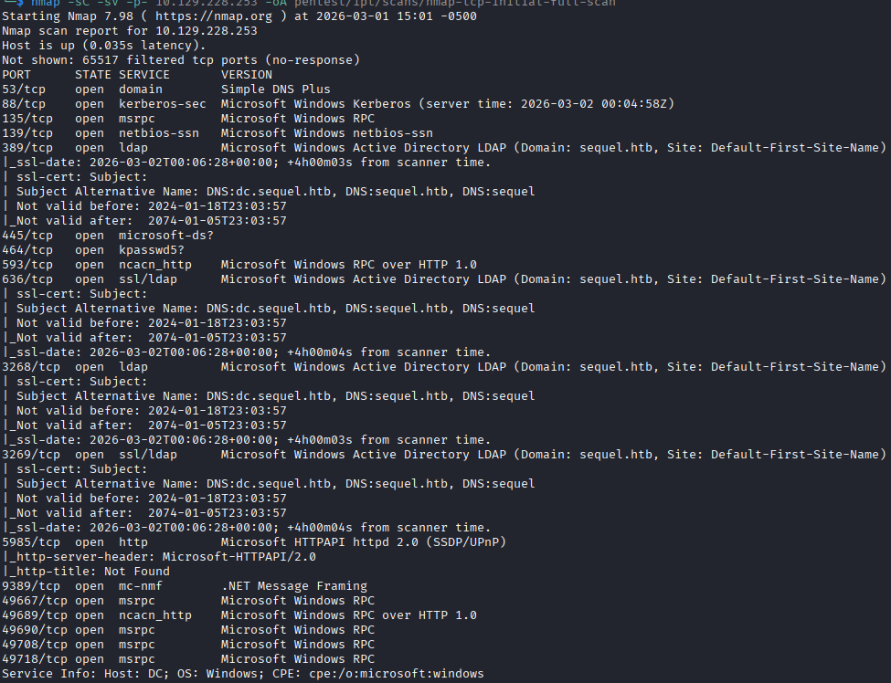 Initial nmap scan shows ports open for a WIndows Active Directory (AD) Domain Controller (DC). Kerberos, SMB, RPC, LDAP, LDAPS, WinRM are all listening. The entry into this box is through MSSQL, I guess I needed to wait a few more minutes for the service to come up, because its not showing up on the initial scan.