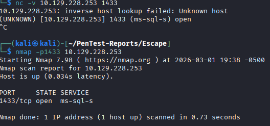 The issue I run into here, is that I do not see a SQL server listening, which complicates things. I run a UDP scan using nmap to see if there is a SQL browser port listening. I test with netcat to see if the port is listening and nmap just missed it, and that seems to be the case. The port is showing open when connecting with netcat. Running a scan against that individual report shows it being open. I can only guess that I ran the nmap scan too quickly before the service was started.