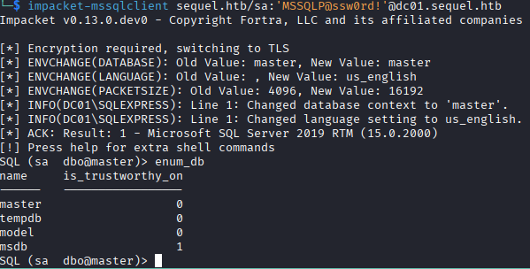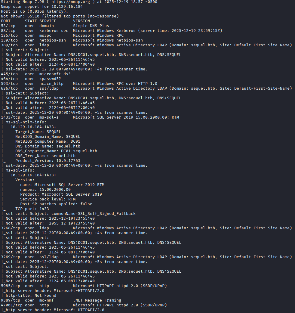 The nmap scan has the usual ports open for a Windows AD box: Kerberos, MSRPC, LDAP, etc. I see the hostname of the box is DC01.sequel.htb, so based on the naming convention its a good guess that this is a domain controller. The one unusual port that is on and listening is TCP port 1433 with Microsoft SQL Server 2019. I could have poked and prodded this SQL server a bit to see if maybe guest accounts were enabled, and in the future I likely will, but instead I went directly to mapping SMB shares using smbclient with the provided credentials and using enum4linux to enumerate the domain a bit.