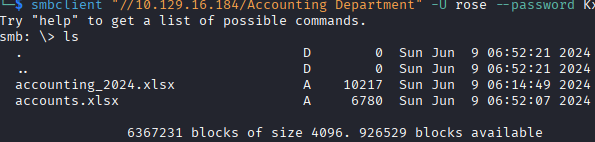 For the initial enumeration, I see there are two unprotected SMB shares that the breached user rose has access to named Users which directs us to what seems like the Public user profile on the box, and Accounting Department, which contains a few Excel documents. The data from enum4linux shows several user accounts on the box, including some seemingly service accounts such as sql_svc and ca_svc. The ca_svc account indicates to me that this box is likely also a Certificate Authority and may have templates worth enumerating, which I do with Certipy. I run the python BloodHound.py collector against the box to enumerate the AD DACL. I'll go over each tool and what important information they provided.