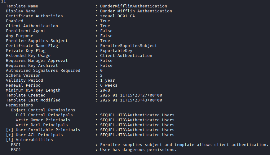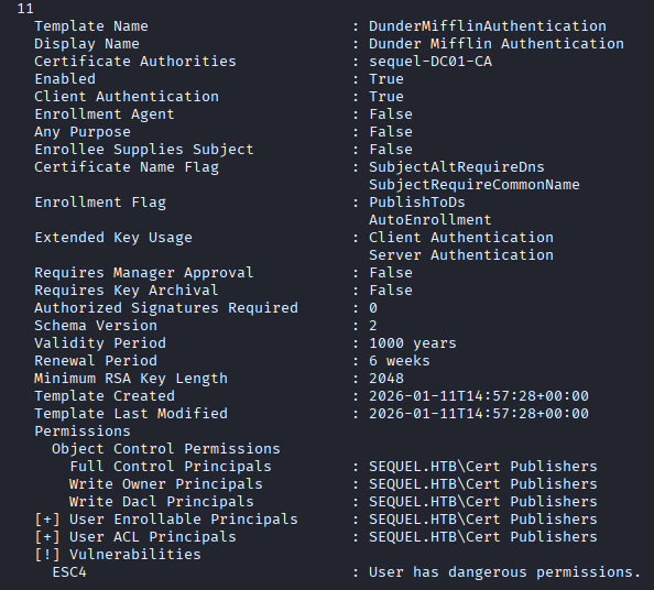 With the NTLM of the ca_svc account, I use Certipy again to enumerate the templates. Here Certipy tells me the DunderMifflinAuthentication template is weak because the user has dangerous permissions over the template.