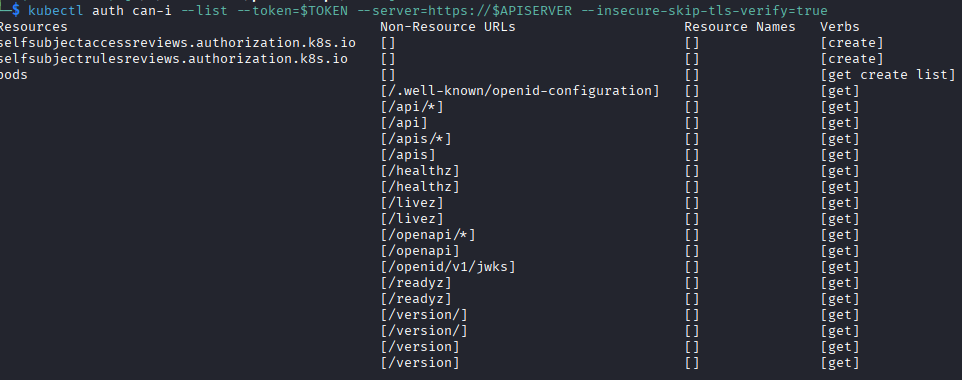 The f.yaml file is the one listed above, the $TOKEN variable is the JWT we took from the /var/run directory, and the $APISERVER is the HTTPS host + 8443 port we initially saw on the nmap scan. -n specifies the namespace, in our case it is default which is the ServiceAccount we have token for.