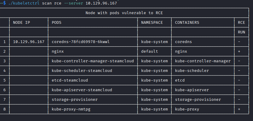 Kubeletctrl shows me which pods allow RCE, which should give me a path in.