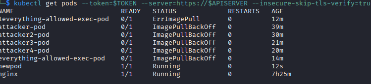 You can see every image I tried besides the “newpod” one running which I had to look up the walkthrough to find exactly what image I needed to specify in the YAML file. In another server that has internet access to repositories, this initial attackpod would likely work to pull images like alpine or the newest nginx image, but in this case since the box has no public IP address, it cannot reach a repository to download an image.