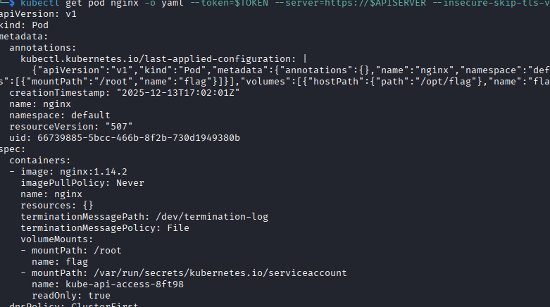 kubectl get pod nginx -o yaml --token=$TOKEN --server=https://$APISERVER --insecure-skip-tls-verify=true