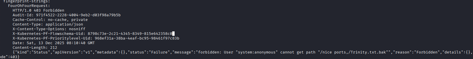 While I'm doing that, after some googling, it seems this message is the default message for a Kubernetes cluster which we can confirm with some of the headers that were sent back on our nmap scans.